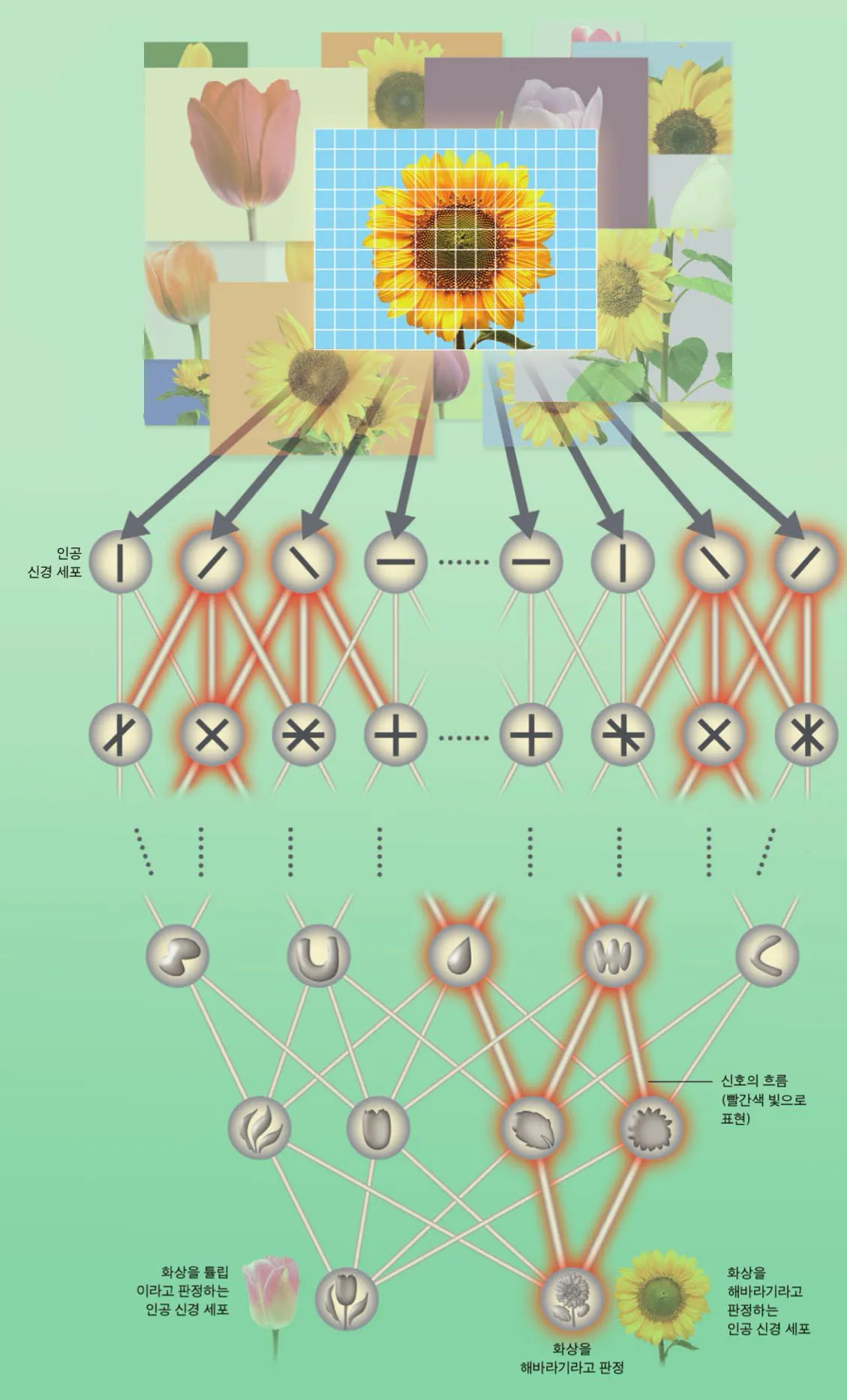 (3) 출력층 : 식별한 특징을 바탕으로 주어진 이미지가 무엇인지를 출력한다. 이 예로 말하면 이미지가 튤립이 아니라 해바라기라고 출력한다.