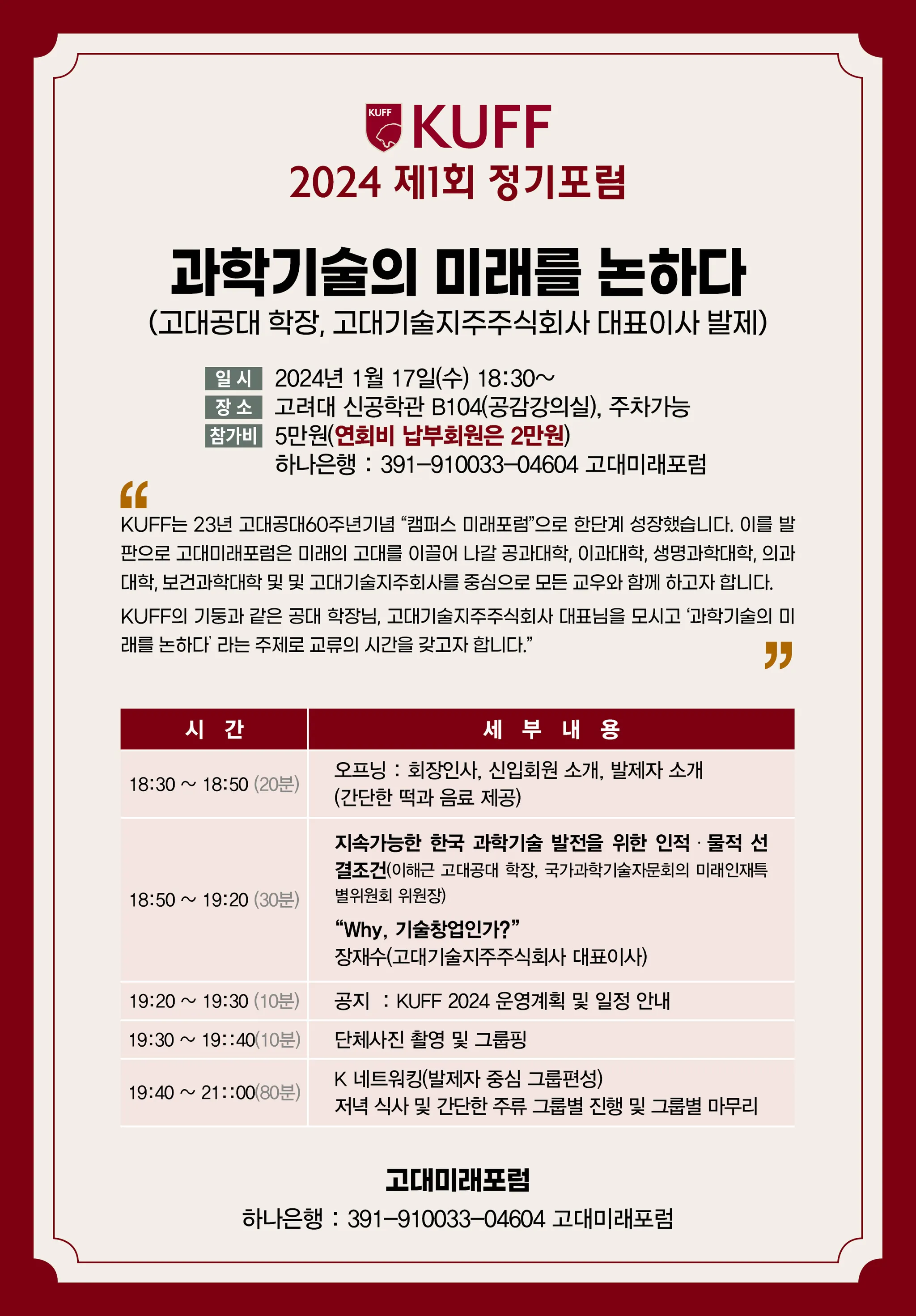 그래서 그 출발을 알리는 24년 신년 특별미래포럼을 이해근 고대공대학장님과 고대기술지주회사 장재수 대표이사님을 모시고 신공학관 캠퍼스에서 시작합니다.